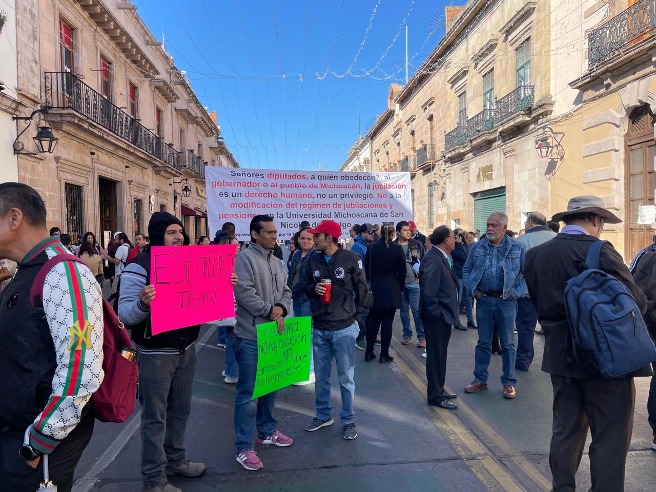 Al grito nicolaita del «pis pas pis pas calis calás calis calás, shh pum, San Nicolás!» profesores de la Universidad Michoacana se manifiestan fuera de Congreso del Estado donde diputados del bloque morenista y sus aliados aprobarán este día, sin más y sin modificación alguna, la reforma bedollista a la Ley Orgánica de la institución, tras solo simular que tomarían en cuenta las opiniones de la comunidad universitaria que se ha manifestado varias veces y que expuso sus argumentos ante los congresistas en varias reuniones.