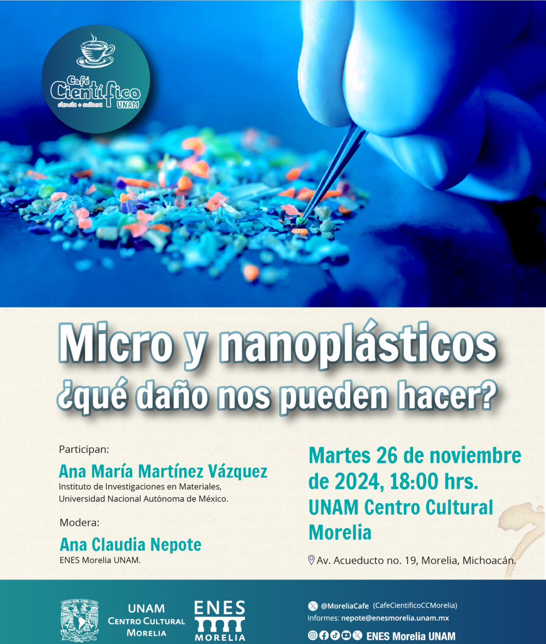 En el marco del 11º aniversario del programa de divulgación y cultura científica “Café Científico”, la Dra. Ana María Martínez Vázquez, reconocida investigadora del Instituto de Investigaciones en Materiales de la UNAM y actual Coordinadora del Consejo Académico del Área de las Físico-Matemáticas y de las Ingenierías de la misma universidad, hablará sobre los daños que causan los micro y nanoplásticos en la salud del ser humano y su impacto en el medio ambiente.