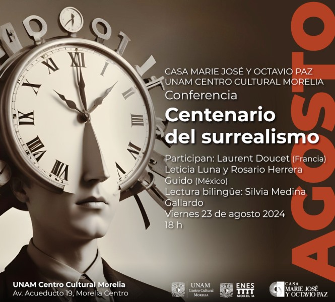 La conferencia “Centenario del surrealismo”, a cargo de los especialistas literarios Laurent Doucet (Francia), Rosario Herrera Guido y Leticia Luna Aguilar (México), se llevará a cabo este viernes 23 de agosto, a las 18:00 horas, en las instalaciones del UNAM Centro Cultural Morelia, ubicado en Av. Acueducto 19, colonia Centro Histórico, Morelia, C.P. 58000, Michoacán.
