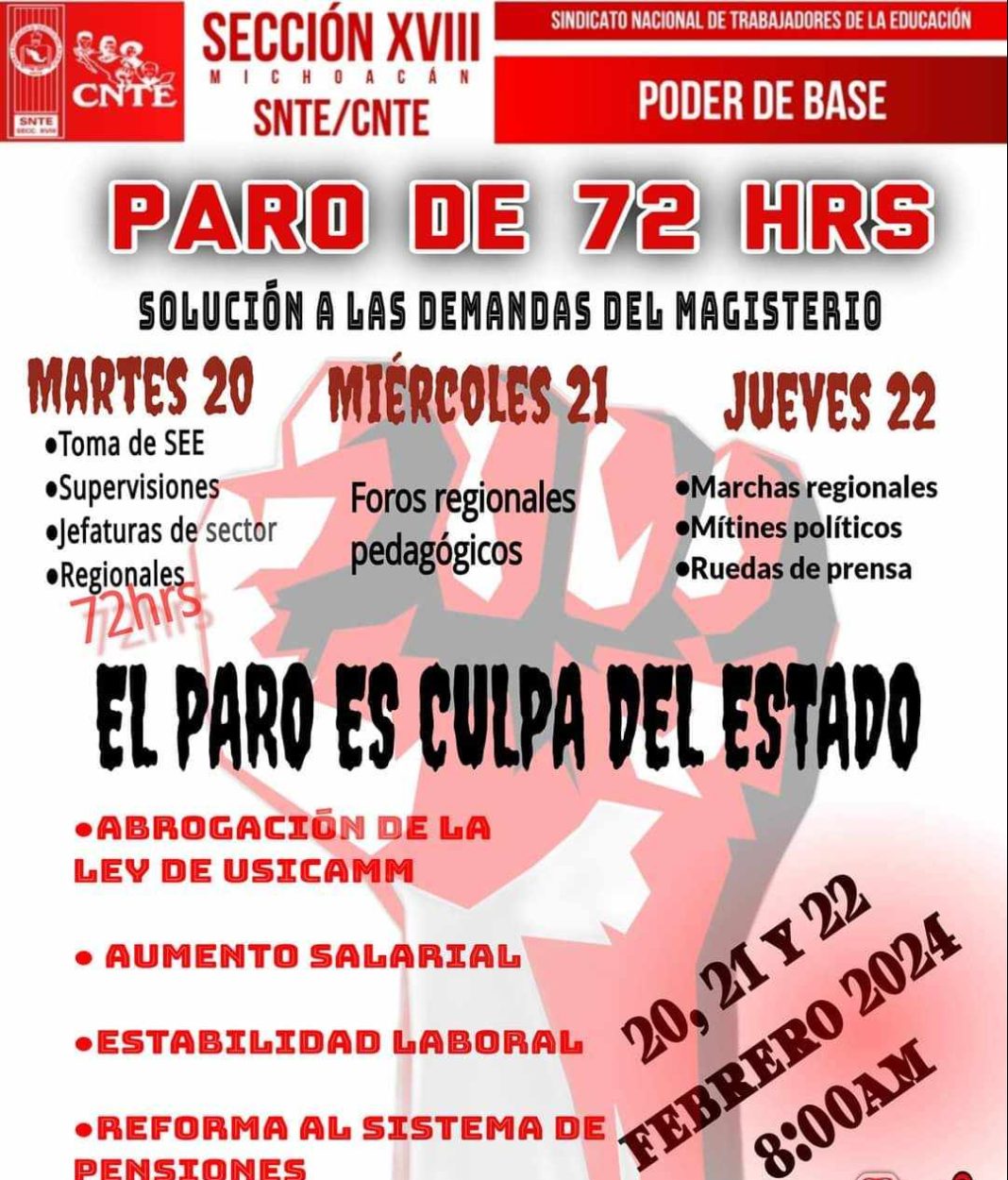 En exigencia de solución a sus demandas y por una serie de incumplimientos de gobierno para con el magisterio, profesores del ala de la CNTE-Poder de Base no acudirán a dar clase desde hoy y durante tres días, habiendo iniciado  este martes un paro de labores de 72 horas. Por tercera semana han cumplido su advertencia de paros escalonados.