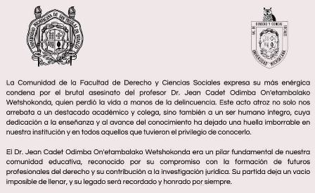 La Facultad de Derecho de la Universidad Michoacana condenó el que calificó como brutal asesinato del profesor Jean Cadet Odimba On’etambalako Wetshokonda, catedrático de esa institución, asesinado esta mañana de Miércoles en la Unidad Deportiva Morelos Indeco, en Morelia.
