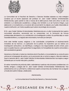 “Hacemos un llamado a todos los miembros de la Facultad y a la sociedad en su conjunto para unirnos en la búsqueda de justicia y en la promoción de un entorno seguro y libre de violencia, que la memoria del doctor nos inspire a seguir luchando por un mundo más justo y pacífico”, dice al final el documento.