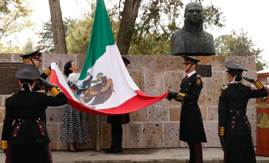Escoltada por la directora del Instituto Tecnológico de Morelia, Patricia Calderón Campos, así como la y los subdirectores, la oradora encabezó la guardia de honor y se depositó una ofrenda al Siervo de la Nación.