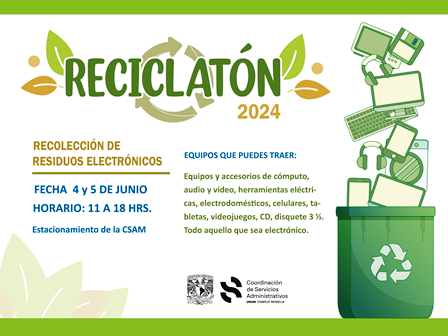 En el marco del Día Mundial del Medio Ambiente, la UNAM Campus Morelia convoca a la sociedad e instituciones de Michoacán al Reciclatón 2024, una actividad que tiene como objetivo contribuir a la concientización del buen manejo de los desperdicios electrónicos que se generan en los hogares morelianos y que, de llegar al basurero municipal, pueden traer problemas de salud y contaminación por metales pesados.