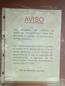 El Centro de Cooperación Regional para la Educación de Adultos en América Latina y El Caribe (CREFAL), que está ubicado en Pátzcuaro, dejará de ser ese centro para convertirse en un ente más de las fallidas y fantasmas «universidades» Benito Juárez de la 4T, toda vez que ha sido destituido todo el personal de la Dirección y en su lugar llegó ya a aposentarse del inmueble la lopezobradorista Raquel Sosa Elízaga, que a partir de hoy impidió la entrada de 100 de los trabajadores poniendo un aviso en la puerta que reza que «las actividades en el CREFAL se suspenderán temporalmente hasta que concluya la auditoría y el proceso de entrega recepción».