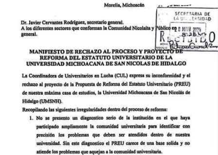 Pablo Martínez, uno de los voceros de la CUL, externó la preocupación de los jóvenes por las irregularidades mostradas por las autoridades de Rectoría respecto a dicho proceso, siendo una de las inconformidades expuestas en el documento que hicieron público los estudiantes, así como el llamado a la comunidad nicolaita y a quienes simpatizan con la causa, para participar de manera activa, “en la concientización de un marco normativo que nos incluya a todos, que refleje de manera justa y democrática los ideales de nuestra Máxima Casa de Estudios, para así responder asertivamente a los desafíos del presente y del futuro que afronte nuestra Universidad”.