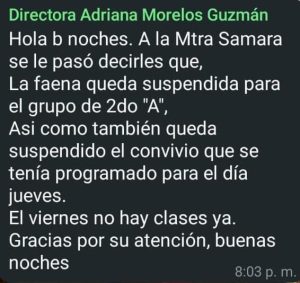 Se presume que le firmó su permuta a la maestra de grupo 2A hacia otro plantel en venganza por no oponerse a la petición de los padres inconformes con las cantidades exorbitantes de dinero y material exigidos para que sus hijos pudieran iniciar las clases de este ciclo escolar 2024-2025, y por si fuera poco, la noche del lunes envió un mensaje de WhatsApp al grupo de padres de familia avisando que el ciclo escolar concluía en este momento, cancelando las clases que restan de esta última semana y por consiguiente el convivio que se tenía planeado para despedir a los pequeñitos como es merecido.