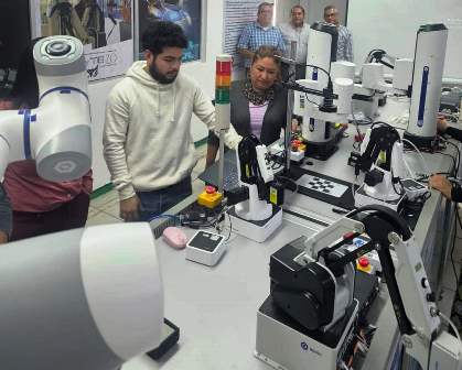 Uruapan, Mich.- Tras una semana de adquirir y reforzar nuevos conocimientos en el área de la robótica, docentes del Colegio de Estudios Científicos y Tecnológicos del Estado de Michoacán (Cecytem) culminaron con el curso-taller Brazos Robóticos Colaborativos.