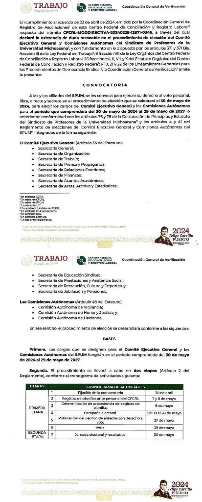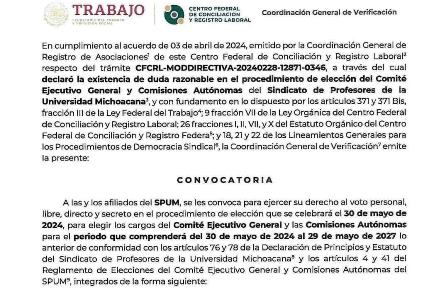 Violentando toda autonomía sindical, y justo después de que el Colegio Electoral del Sindicato de Profesores de la Universidad Michoacana notificase que era formal y ratificaba la convocatoria de elección del nuevo dirigente para el 9 de Mayo, el Centro Federal de Conciliación y Registro Laboral emitió esta tarde los lineamientos para que el SPUM proceda a sujetarse a la convocatoria de la que tendrá total control esta autoridad laboral federal, que marca el día de elección para el 30 de Mayo mediante jornada de voto en 4 puntos: el Gimnasio de Usos Múltiples, la Facultad de Odontología, el campus de Uruapan y la Facultad de Ciencias Agrobiológicas en Apatzingán.