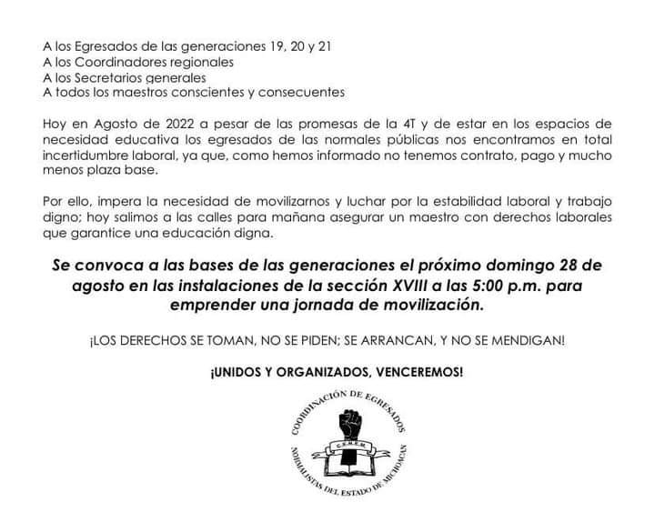 En el llamado oficial emitido este fin de semana por la Coordinación de Egresados, acusan que pese a las promesas del Gobierno Federal de resolver como ellos exigen, están en la incertidumbre laboral al no contar con contrato, pago ni plaza base: “por ello impera la necesidad de movilizarnos y luchar por la estabilidad laboral y trabajo digno».