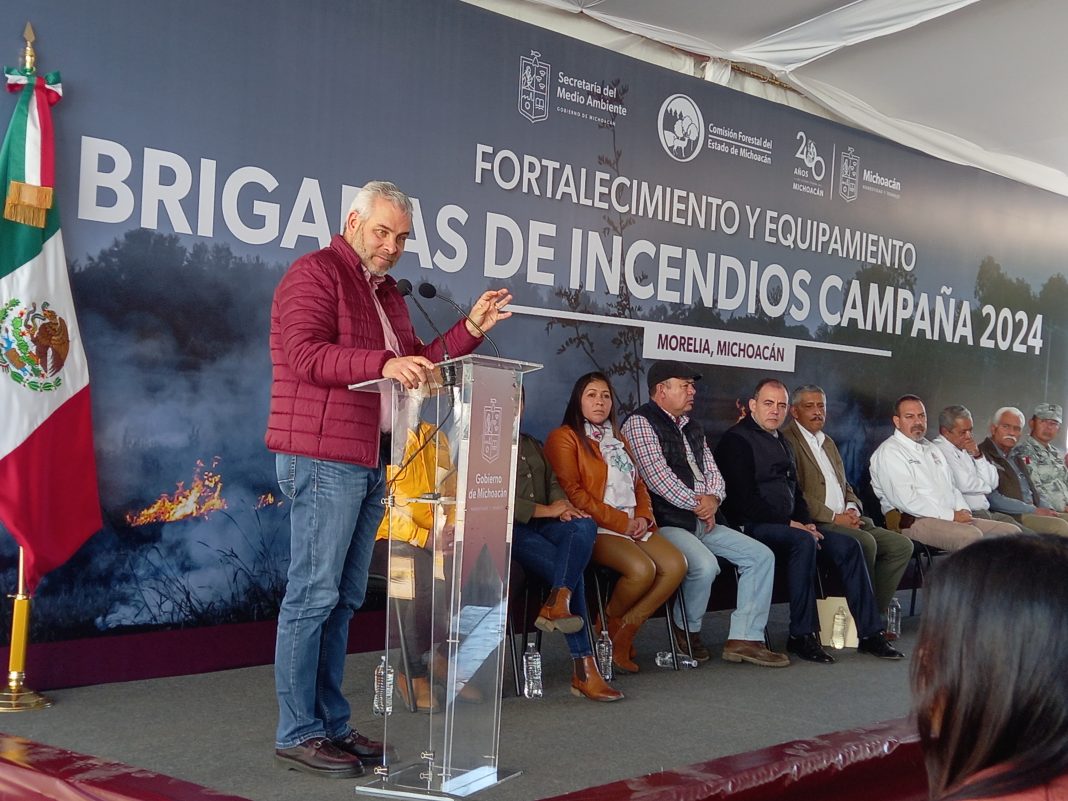 El 95 por ciento de los incendios forestales son provocados, señaló el gobernador Alfredo Ramírez Bedolla, durante el Fortalecimiento y Equipamiento a las Brigadas de Incendios Campaña 2024.