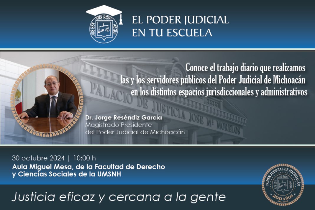El primer encuentro de El Poder Judicial de Michoacán en tu escuela se realizará este miércoles en la Facultad de Derecho y Ciencias Sociales de la Universidad Michoacana de San Nicolás de Hidalgo. En esta ocasión, el magistrado presidente estará presente para interactuar con las y los estudiantes, quienes tendrán la oportunidad de realizar preguntas y dialogar directamente con quien encabeza la administración de justicia en el estado.