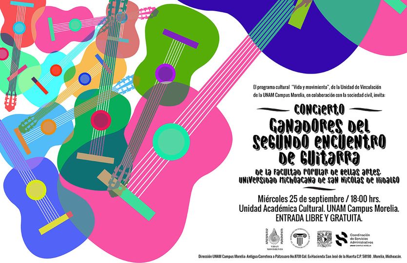 El talento y destreza de destacados guitarristas michoacanos llegará al Auditorio de la Unidad Académica-Cultural de la Universidad Nacional Autónoma de México (UNAM) Campus Morelia con la presentación del Concierto de Guitarra a cargo de los Ganadores del Segundo Encuentro Universitario de la Facultad Popular de Bellas Artes de la Universidad Michoacana de San Nicolás de Hidalgo (UMSNH).