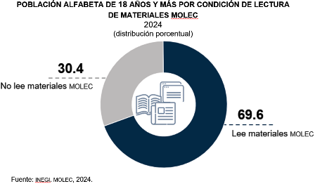Los resultados indican que 69.6 % de la población alfabeta de 18 años y más declaró haber leído al menos uno de estos materiales de lectura.