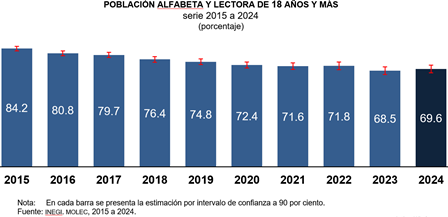 La lectura ejercita el cerebro, estimula la curiosidad y potencia la creatividad. Según resultados del MOLEC, el porcentaje de población lectora disminuyó 14.6 puntos porcentuales entre 2015 (84.2 %) y 2024 (69.6 %). No obstante, respecto al dato de 2023 se observa un ligero aumento de 1.1 puntos porcentuales.