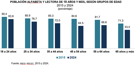El descenso de la población lectora se pronunció más entre los hombres, cuyo indicador pasó de 86.7 % en 2015 a 69.9 % en 2024. En el caso de las mujeres, disminuyó de 81.9 a 69.3 por ciento.