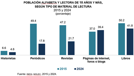 Con relación a los materiales MOLEC, en 2024 los libros fueron los más leídos, con 41.8 por ciento. Siguieron las páginas de Internet, foros o blogs, con 39.4 %; revistas, con 21.7 %; periódicos, con 17.8 % e historietas, con 4.6 por ciento.