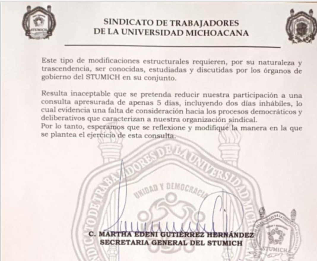 En el caso del STUMICH, el otro sindicato de empleados, su lideresa Marta Edeni Gutiérrez Hernández, respondió por medio de oficio formal al secretario de la Universidad Michoacana, Javier Cervantes Rodríguez, que «resulta paradójico» que Rectoría nunca contempla ni consulta, ni hace caso al STUMICH como empleados nicolaitas que son, y ahora sí para aprobar un proyecto apresurado de nueva Ley Orgánica les envían una solicitud de que todo el gremio participe, y recrimina que «resulta inaceptable que se pretenda reducir nuestra participación a una consulta digital de únicamente cinco días atravesándose dos días inhábiles» que fue este fin de semana, cuando estos cambios estructurales que quieren hacer al régimen de pensiones y jubilaciones requieren de una revisión minuciosa y personal en que las partes puedan revisarlo y discutirlo de manera muy puntual, no nada más votar a favor cómo lo pide la rectora.
