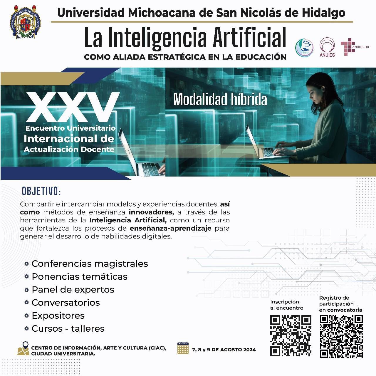 Morelia, Michoacán.- Con la presencia de especialistas de talla mundial y nacional en el tema de la Inteligencia Artificial, se realizará el XXV Encuentro Universitario Internacional de Actualización Docente, del 7 al 9 de agosto, en el Centro de Información, Arte y Cultura (CIAC) de la Universidad Michoacana de San Nicolás de Hidalgo (UMSNH).