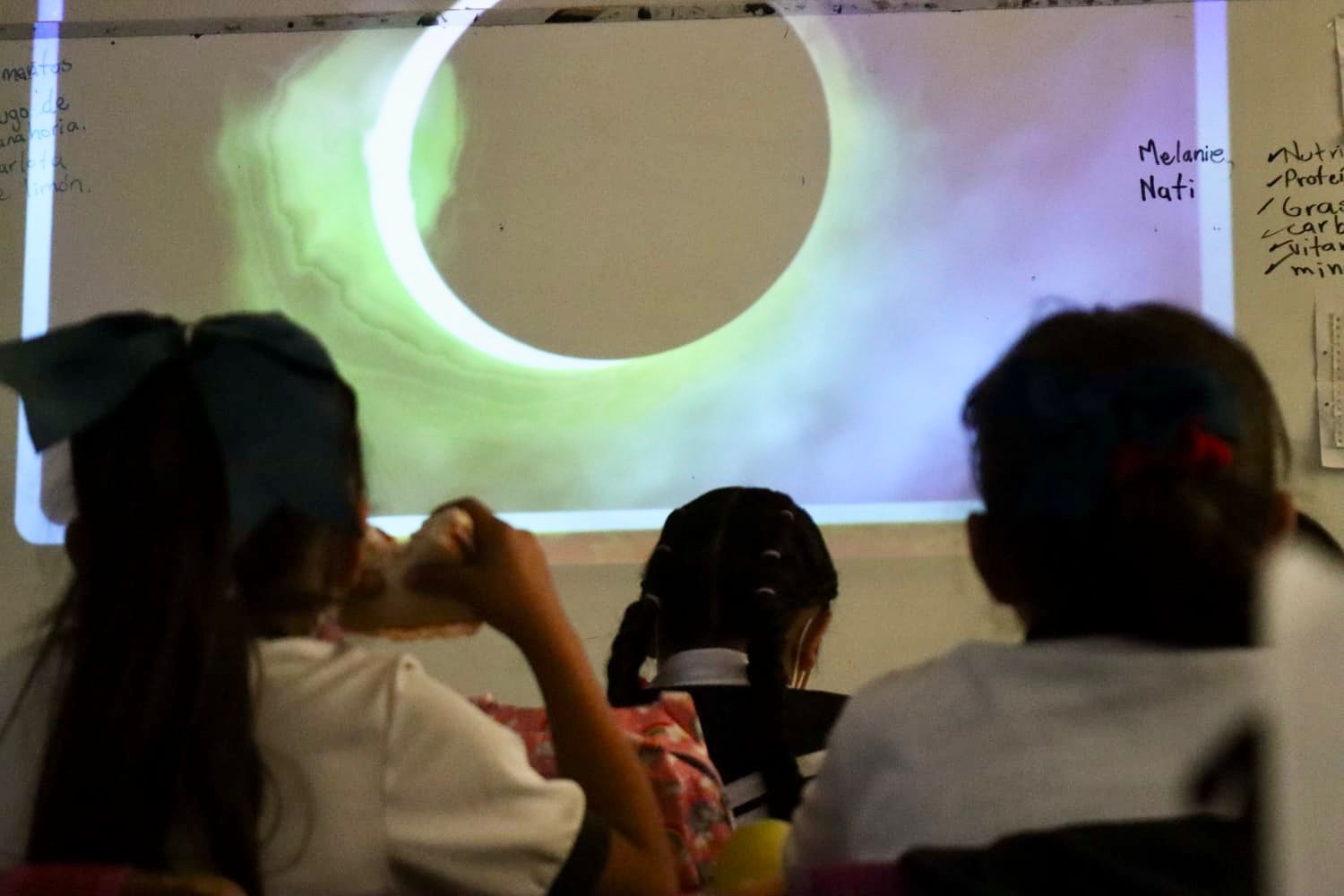 Este lunes, con el regreso a clases y el eclipse solar, miles de estudiantes de primarias y secundarias en todo el estado realizan actividades en sus escuelas para enriquecer su conocimiento astronómico.