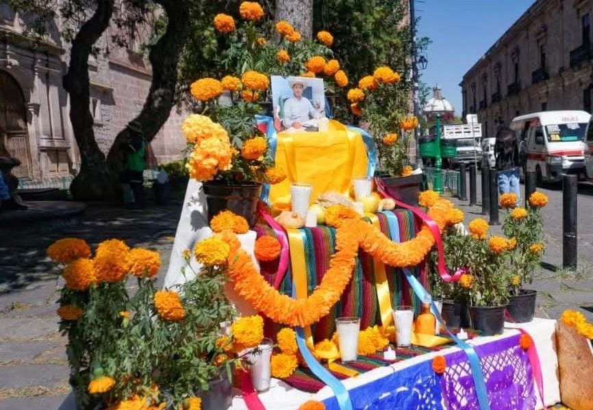 Justo cuando estaban a punto de retirar las ofrendas del Día de Muertos, hoy han colocado un altar en honor de Manzo Rodríguez en su memoria y también a manera de protesta ante la creciente ola de violencia e inseguridad que se vive en Michoacán y en el país, que ha quedado a la vista de los transeúntes.