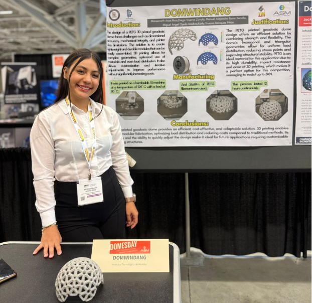 Mientras que el equipo Domwindang, conformado por los alumnos de Ingeniería en Materiales, Monserrath Arias Rico, Karla Viviana Márquez Piñón, Diego Viveros Zavala, Manuel Alejandro Bucio Sevilla y Miguel Ángel Ojeda Medina, recibieron el premio a la mejor destrucción de un domo geodésico construido a partir de impresión 3D. Los alumnos compitieron contra equipos de instituciones como la Universidad de Utah, la Universidad de McMaster, el Tecnológico de Michigan y la Universidad de Arizona, por mencionar algunas.