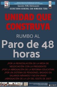 La líderesa centista adelantó que habrá otros dos paros escalonados de clases y labores a nivel nacional próximos, tras el paro de 24 horas del viernes pasado. Por lo que viene el de 48 horas simultáneo, y después uno de 72 horas para continuar con la nueva jornada nacional de movilizaciones de presión a los gobiernos Federal en sus demandas, y el estatal también en el pliego petitorio correspondiente a este ámbito que incluye la exigencia de descongelar las plazas en la SEE y que ésta las asigne.