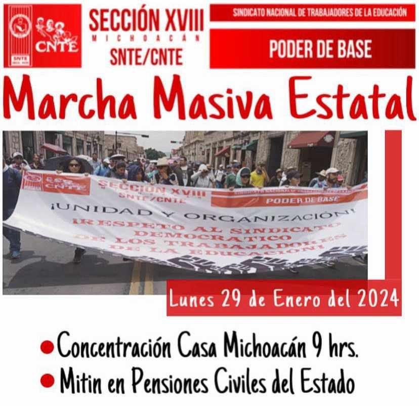 En exigencia del 50 por ciento de aumento salarial, reforma a la ley de la USICAMM para los procesos de ingreso formal al Servicio Profesional Docente o ascensos que les obliga a ser evaluados por examen, y en demanda de que gobierno bedollista respete los derechos laborales de los trabajadores de la educación, han sido convocados los agremiados de la CNTE-Poder de Base a paro laboral y de clases este lunes, y a manifestarse en marcha hacia la Dirección de Pensiones Civiles del Estado.