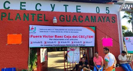 Trabajadores del CECYTEM exigen les sean pagados 25 millones de pesos que se les adeudan de varias prestaciones desde hace meses, así como la salida de Víctor Báez Ceja: con él ha sido la peor administración del subsistema, acusan, y por lo cual han parado labores totales en los 93 planteles en todo el estado.