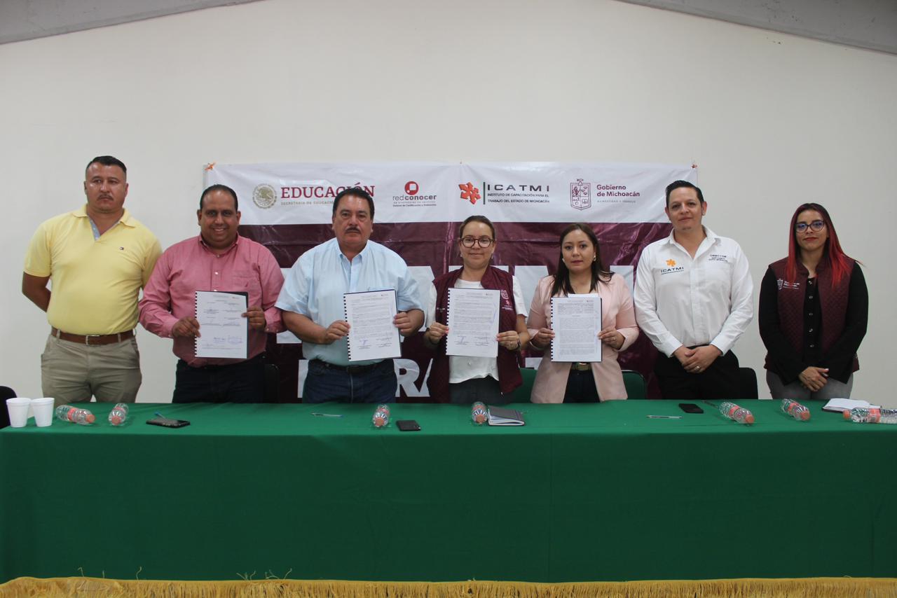 Morelia, Michoacán.- El Instituto de Capacitación para el Trabajo del Estado de Michoacán (Icatmi) realizó la firma de tres convenios de colaboración interinstitucional con los Ayuntamientos de Irimbo, Aporo y Maravatío, quienes sumarán esfuerzos para atender a la población a través de cursos que se adecuen a la economía de cada región.