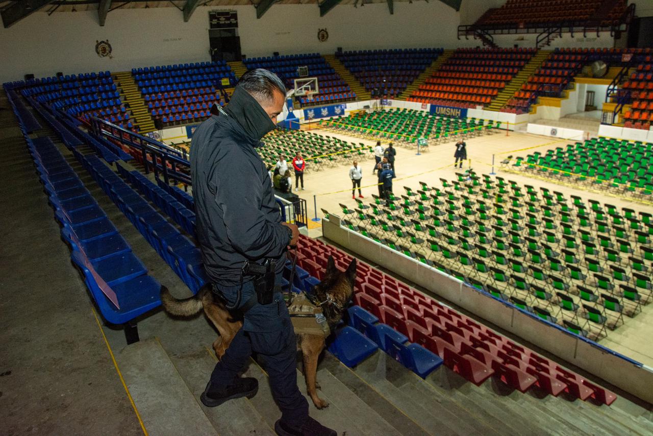Con el objetivo de garantizar la seguridad para las y los aspirantes, en el primer día del examen de admisión de la Universidad Michoacana de San Nicolás de Hidalgo, elementos de la Guardia Civil realizaron un recorrido de supervisión con los binomios caninos por las instalaciones del Gimnasio de Usos Múltiples ubicado en Ciudad Universitaria, mismo que recibiría desde el 23 hasta el 27 de junio a más de 25 mil aspirantes. En el recorrido participaron los secretarios Académico, Antonio Ramos Paz, Administrativo, César Macedo, la Contralora, Alejandra Martínez y la directora de Control Escolar, Maricela Morfín.