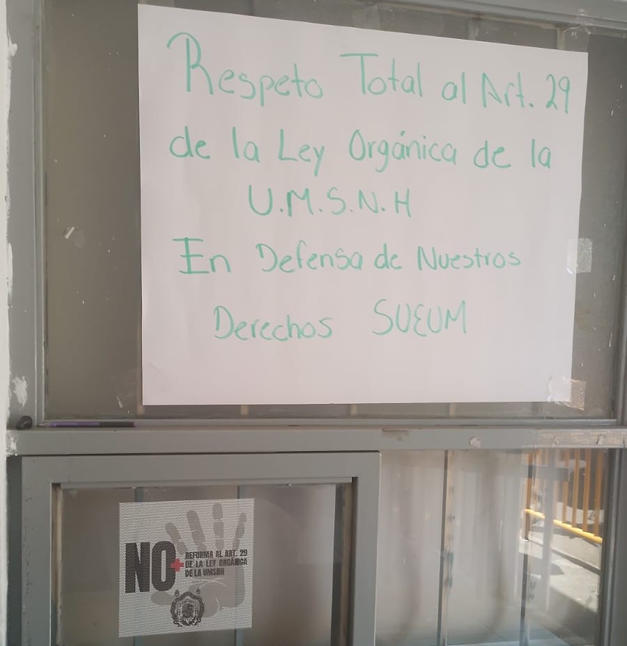 Trabajadores del Sindicato de Empleados de la Universidad Michoacana han iniciado desde esta mañana de Lunes con la pega en todas las oficinas de la universidad Michoacana del distintivo que reza «no a la reforma», que deja muy en claro su rechazo a este proceso del cual dudan y mismo que lleva a cabo una autoridad de Rectoría de la que también dudan y a la cual también denostan, y de un proyecto con el cual no están de acuerdo y que rechazan tajantemente porque violenta sus derechos laborales.