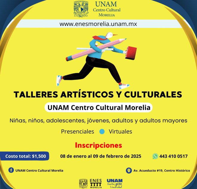 Las inscripciones se realizarán del 08 de enero al 09 de febrero de 2025, los talleres se llevarán a cabo de febrero a junio de 2025, toda la oferta de talleres se puede consultar a través de la página de la ENES Morelia UNAM (https://www.enesmorelia.unam.mx/talleres-culturales-y-artisticos-2025-unam-centro-cultural/). Estos cursos tienen una cuota única de recuperación de mil 500 pesos por el cuatrimestre, el público interesado podrá realizar su pago mediante tres opciones: pago en línea con tarjeta; ficha de depósito en banco; o a través de transferencia electrónica (sólo si cuenta con banca BBVA).