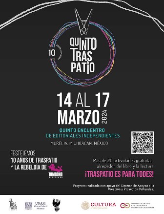Este jueves y viernes, la UNAM Centro Cultural Morelia, de la Escuela Nacional de Estudios Superiores (ENES Morelia UNAM), será sede de las actividades del décimo aniversario de la librería independiente “El Traspatio”, y la quinta edición del Encuentro de editores y editoriales independientes. “El Traspatio: Lo que sucede detrás del libro”, un espacio dedicado a la promoción, el fomento y la divulgación del quehacer editorial independiente y la literatura a nivel nacional.