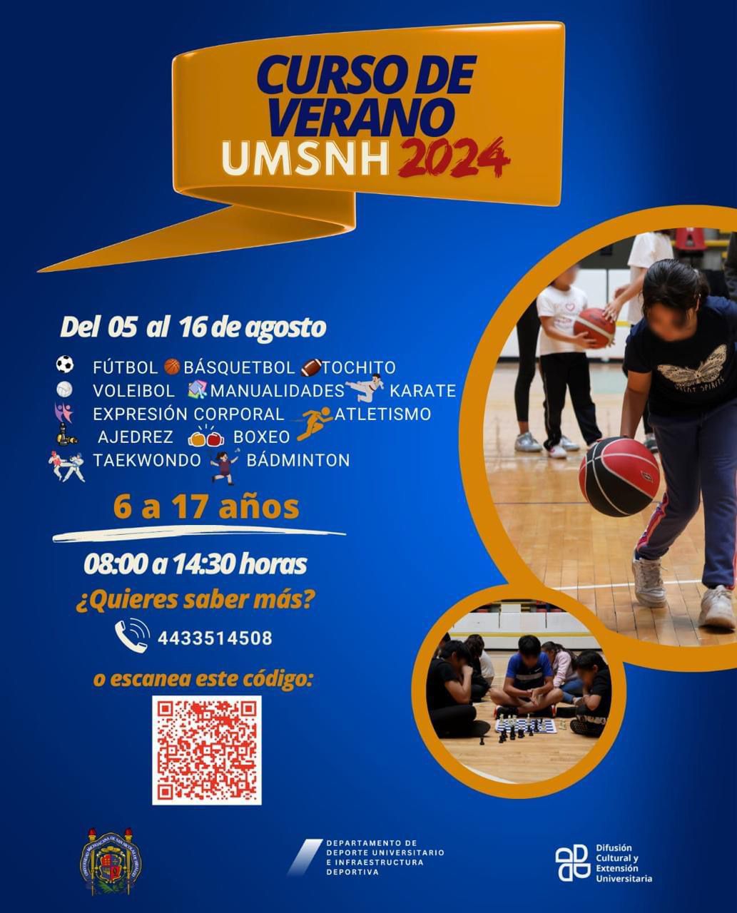 Morelia, Michoacán.- Con una serie de actividades deportivas, artísticas y culturales, la Universidad Michoacana de San Nicolás de Hidalgo se prepara para recibir durante este periodo vacacional a niñas, niños y adolescentes de 6 a 17 años en su Curso de Verano UMSNH 2024, que se organiza a través de la Secretaría de Difusión Cultural y Extensión Universitaria.