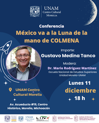 La UNAM Centro Cultural Morelia, de la Escuela Nacional de Estudios Superiores (ENES Morelia UNAM), será sede de la charla “México va a la luna de la mano de COLMENA” a cargo del destacado científico Gustavo Medina Tanco, el próximo 11 de diciembre a las 18:00 horas.