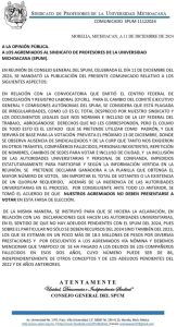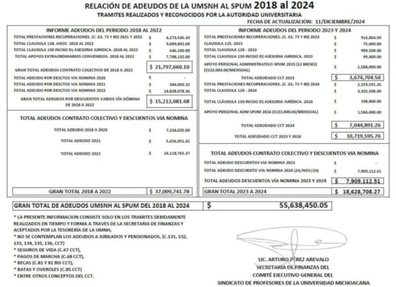 Expone también el máximo órgano de gobierno del Sindicato de Profesores de la Universidad Michoacana un desmentido referente a las declaraciones de Rectoría sobre que no se tienen adeudos con los profesores académicos agremiados cuando sí hay pendientes por cumplir desde el año anterior por 18.5 millones de pesos entre descuentos y también prestaciones no pagadas a los spumistas, además de todos los adeudos que se tienen de este 2024 que no han sido saldados, el no pago a los deudos de profesores fallecidos durante los dos años de la pandemia, y además de adeudos todavía anteriores del 2022 hacia atrás.