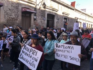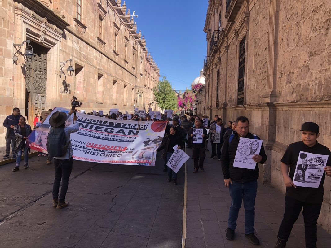 Profesores, alumnos y padres de familia de la Secundaria Popular marcharon este medio día para exigir a la rectora Yarabí Ávila detenga la orden de desalojo del edificio que alberga dicha escuela pero que es propiedad de la Universidad Michoacana de San Nicolás de Hidalgo.