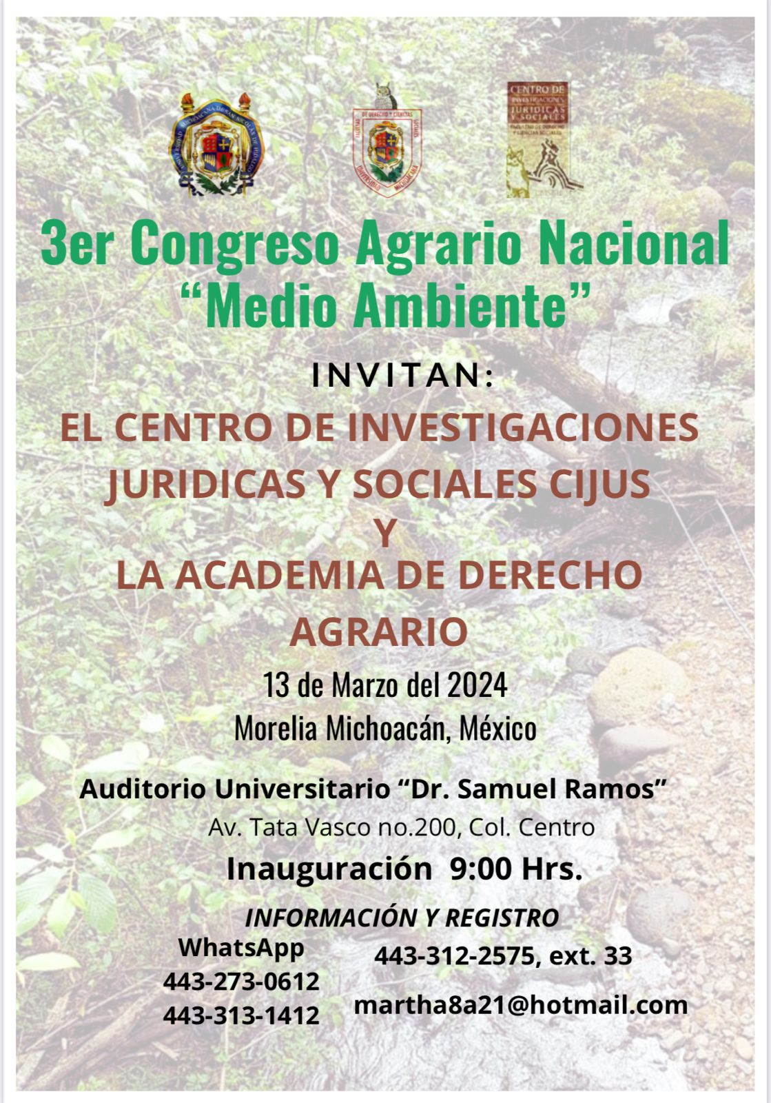 Morelia, Michoacán.- El medio ambiente será el tema principal a abordar en el tercer Congreso Agrario Nacional organizado por el Centro de Investigaciones Jurídicas y Sociales (CIJUS) de la Facultad de Derecho y Ciencias Sociales de la Universidad Michoacana de San Nicolás de Hidalgo (UMSNH) y la Academia de Derecho Agrario, que se realizará el próximo 13 de marzo.