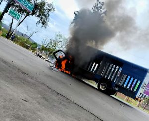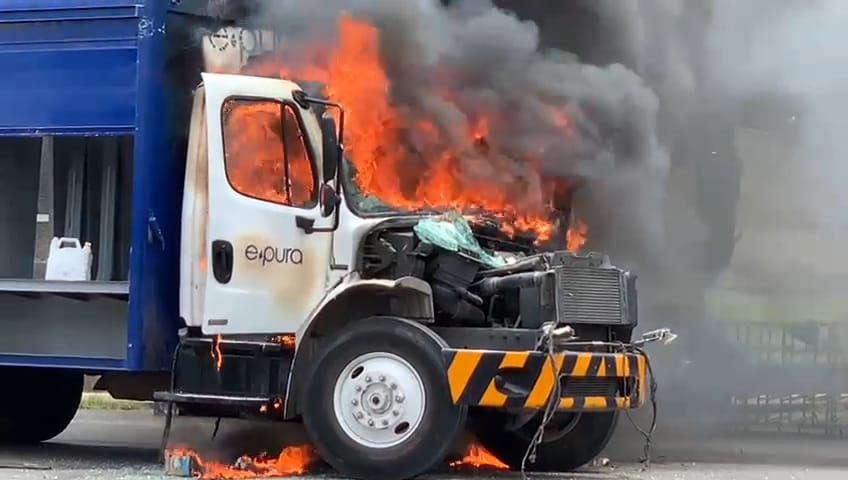 Normalistas incendiaron un camión repartidor de agua «e’pura», esto en el libramiento frente a la avenida Siervo de la Nación, muy cerca de las instalaciones de la Fiscalía General del Estado (FGE).