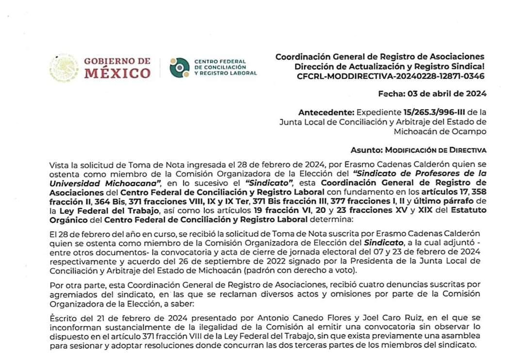 La Coordinación General de Registro de Asociaciones del Gobierno de México invalidó y echó abajo la elección interna de nuevo dirigente que llevaron a cabo los disidentes del Sindicato de Profesores de la Universidad Michoacana a fines de febrero pasado, y que fue sin siquiera contar con presencia de personal del Centro Federal de Conciliación Laboral para darle legalidad al proceso.