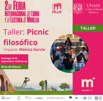 Además, presentará un taller de filosofía para niñas y niños en el que simulando un picnic dialogarán entorno a las emociones, ideas, alegrías y miedos a partir de la lectura de un libro infantil, esta actividad se realizará el domingo 24 de septiembre, a las 12:00 horas.