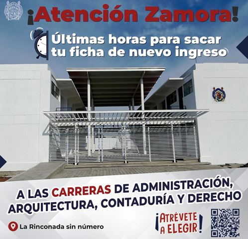 Arquitectura, Derecho, Contaduría y Administración son las carreras que oferta la Unidad Profesional de Zamora de la Universidad Michoacana de San Nicolás de Hidalgo (UMSNH), que abre sus puertas a partir del ciclo escolar 2024-2025.