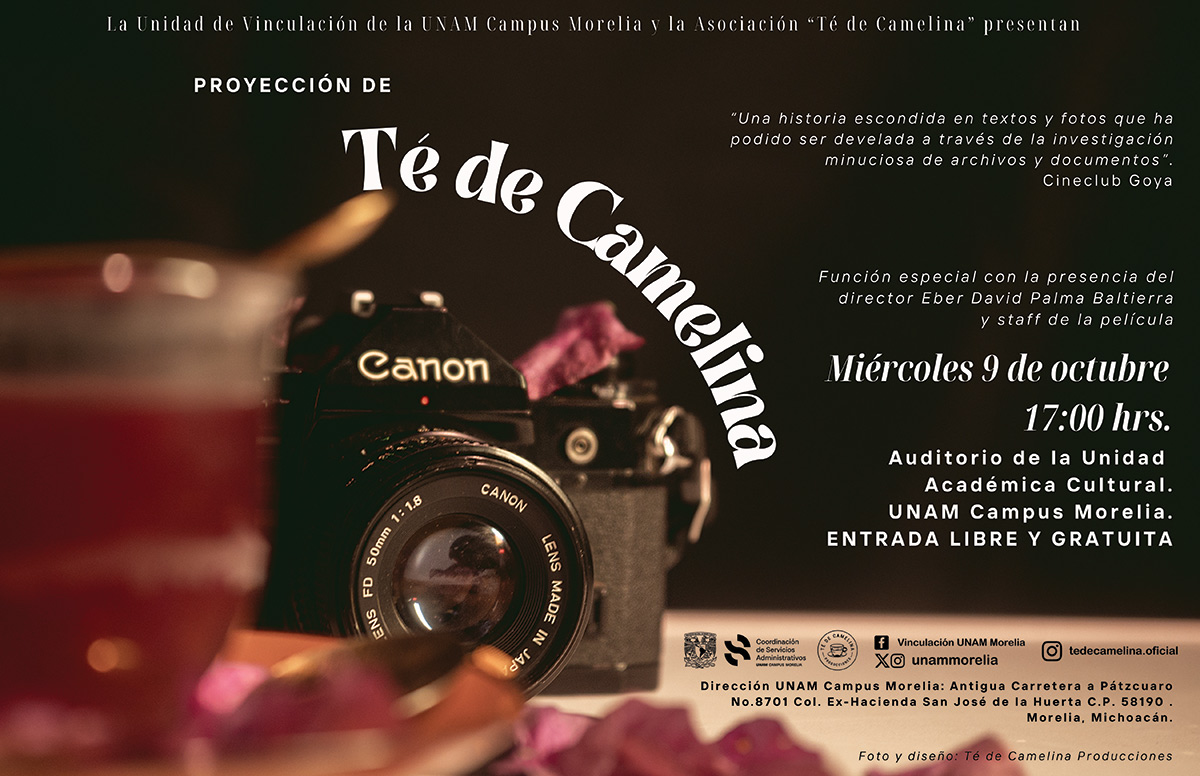 El mediometraje “Té de Camelinas” se presentará el 9 de octubre a las 17 horas (5 de la tarde) en el Auditorio de la Unidad Académica Cultural de la Universidad Nacional Autónoma de México (UNAM) Campus Morelia, en una función donde están invitados todos los amantes del cine.