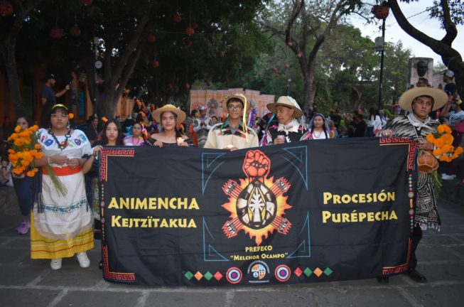 La viva tradición de los sones, trajes típicos y danzas llegaron al Centro Histórico  a través de los estudiantes de la Preparatoria Federal por Cooperación PREFECO “Melchor Ocampo”, protagonistas de la Procesión Purépecha, uno de los eventos más representativos que enmarcan el Día de Muertos en la capital michoacana.