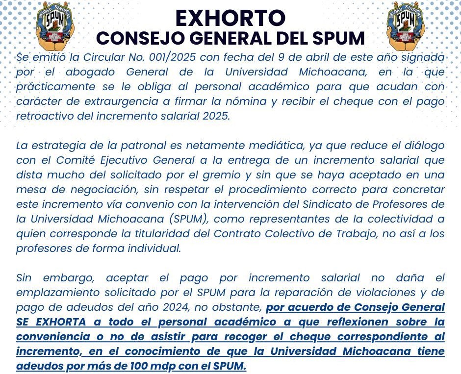 Por acuerdo del Consejo General del Sindicato de Profesores de la Universidad Michoacana han exhortado a todos los académicos nicolaitas a reflexionar sobre la conveniencia o no de recoger el cheque correspondiente al incremento salarial que comenzó a ser emitido este viernes y con pago por esta única vez vía documento bancario. Ello tomando en cuenta que rectoría adeuda más de 100 millones de pesos a los spumistas.