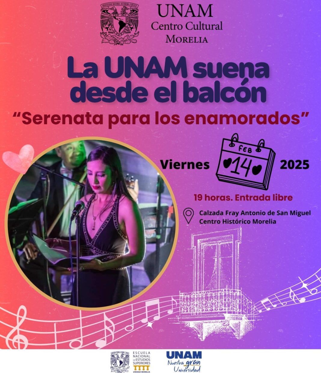 “La UNAM suena desde el balcón” inició en 2023 con el objetivo de difundir el talento de artistas michoacanos, de diversas partes del país y del extranjero en espacios públicos de Michoacán. En esta nueva edición, se realizará un concierto con música romántica desde los balcones que hará latir la Calzada San Diego con la voz de la soprano Luz Andrea Romero Castellanos.