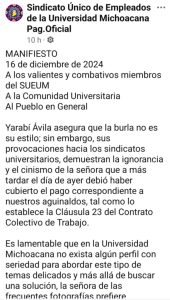 El Sindicato Único de Empleados de la Universidad Michoacana ha reclamado este lunes por la noche que Yarabí Ávila González cumpla y les pague el aguinaldo, mismo que debió haber quedado cubierto a más tardar el día de ayer tal como lo estipula la cláusula 23 de su contrato colectivo de trabajo.