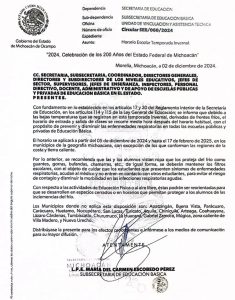 A partir de este 5 de diciembre y hasta el 17 de febrero del 2025 queda vigente este nuevo horario de ingreso a clase en los municipios de la geografía Michoacana, con excepción de los ubicados en las regiones calientes de la entidad: Apatzingán, Buenavista, Paracuaro, Carácuaro, Huetamo, Nocupetaro, San Lucas, Turicato, Aquila, Chinicuila, Arteaga, Coahuayana, Lázaro Cárdenas, Tumbiscatío Castillo, Churumuco, la Huacana, Gabriel Zamora, Mujica, la zona caliente de Villa Madero y Nuevo Urecho.