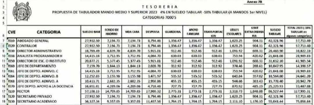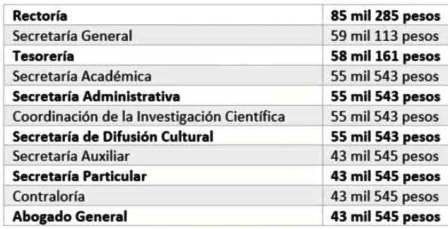 El sueldo del tabulador arroja que a esta fecha quien es titular de Rectoría en este caso Ávila González, percibe al mes 85 mil mil 265 pesos, el secretario general de la institución que es Javier Cervantes, 59 mil 113 pesos, el secretario académico, cargo que ostenta Jorge Fonseca 55 mil 543, en tanto quien es titular de la Secretaría Administrativa 55 mil 543 pesos, el coordinador de la Investigación Científica 55 mil 543, el secretario de Difusión Cultural, que es Miguel Ángel Villa 55 mil 543 pesos , quien encabeza la Secretaría Auxiliar 43 mil 545, el secretario particular de la rectora 43 mil 545 pesos, quien es titular de la Contraloría 53 mil 545, y el abogado general de la institución que es Raúl Carrera percibe 43 mil 545 pesos al mes.